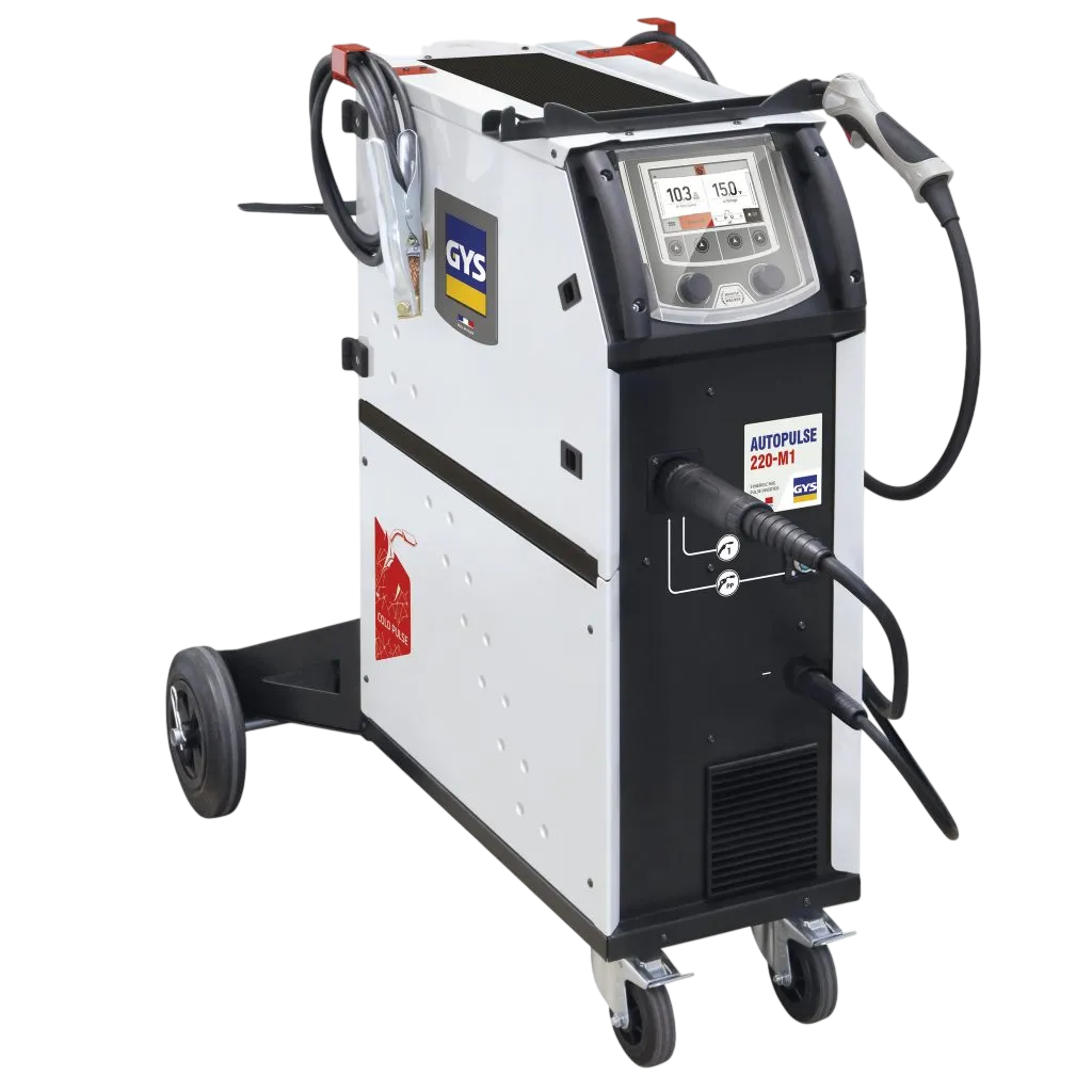 The AUTOPULSE 220-M1 is the MIG / MAG pulse generator with an integrated wire feeder for the car body. Equipped with a digital PFC (Power Factor Correction) it supplies pulsed welding quality comparable to three-phase products. Designed for the highest performance it features several synergic curves and exceptional arc quality. Versatile, it can carry out all types of welding: Steel, Aluminum, and Silicon bronze. Its intuitive interface and its high precision wire feed are ideal for car-body with the best welding quality even on thin sheets.